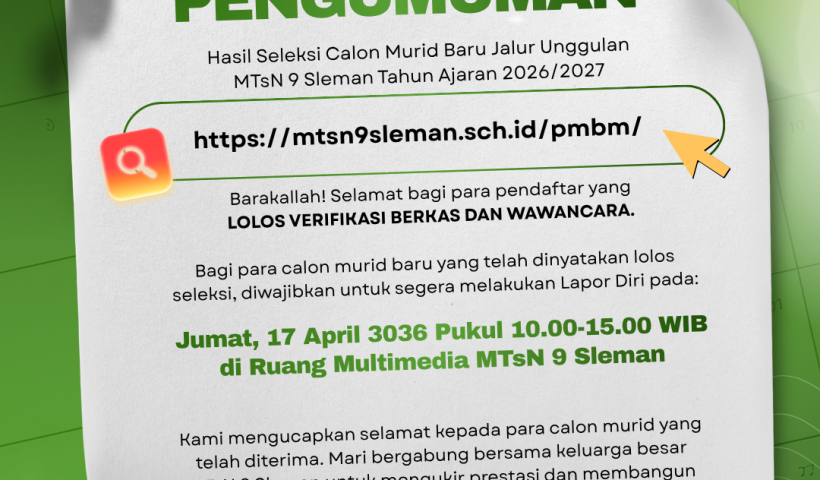 View More PENGUMUMAN: Hasil Seleksi Calon Murid Baru Jalur Unggulan MTsN 9 Sleman Tahun Ajaran 2026/2027Kemah Akhir Tahun Siswa Kelas VII MTsN 9 Sleman Berlangsung di Bumi Perkemahan Candi Banyunibo