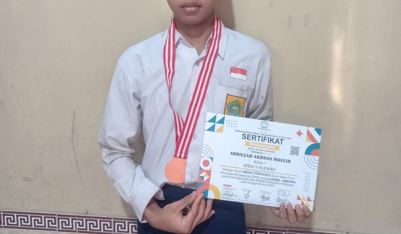 Sleman (MTsN 9 Sleman)- Abdillah Akhdan Muslih siswa MTsN 9 Sleman berhasil meraih medali perunggu setelah menempati posisi juara 3 dalam babak final Olimpiade PAI…