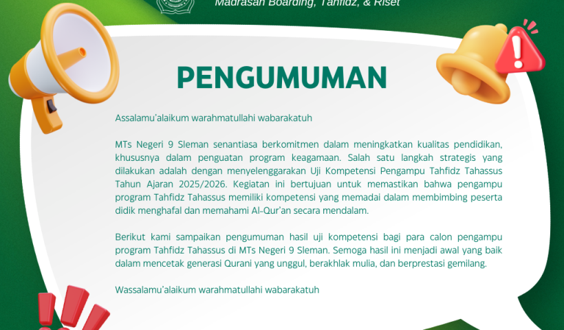 View More PENGUMUMAN: Hasil Seleksi Tahap I Jalur Tahfidz Terpadu MTsN 9 Sleman TA 2026/2027Pengumuman Hasil Uji Kompetensi Pengampu Tahfidz Takhassus