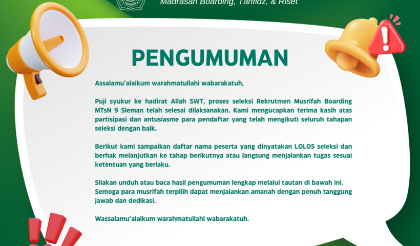 Assalamu’alaikum warahmatullahi wabarakatuh,Puji syukur ke hadirat Allah SWT, proses seleksi Rekrutmen Musrifah Boarding MTsN 9 Sleman telah selesai dilaksanakan. Kami mengucapkan terima kasih atas partisipasi…