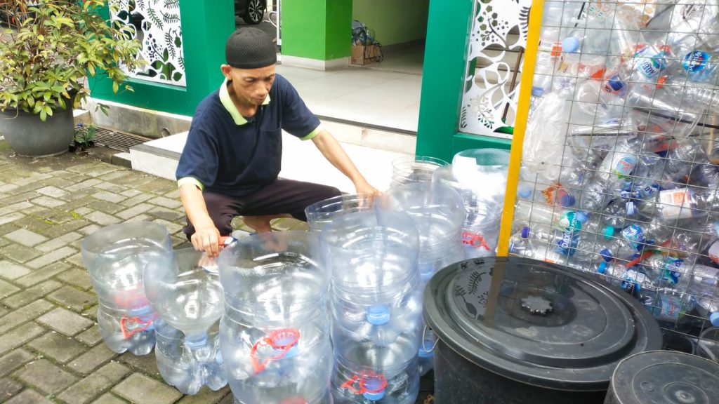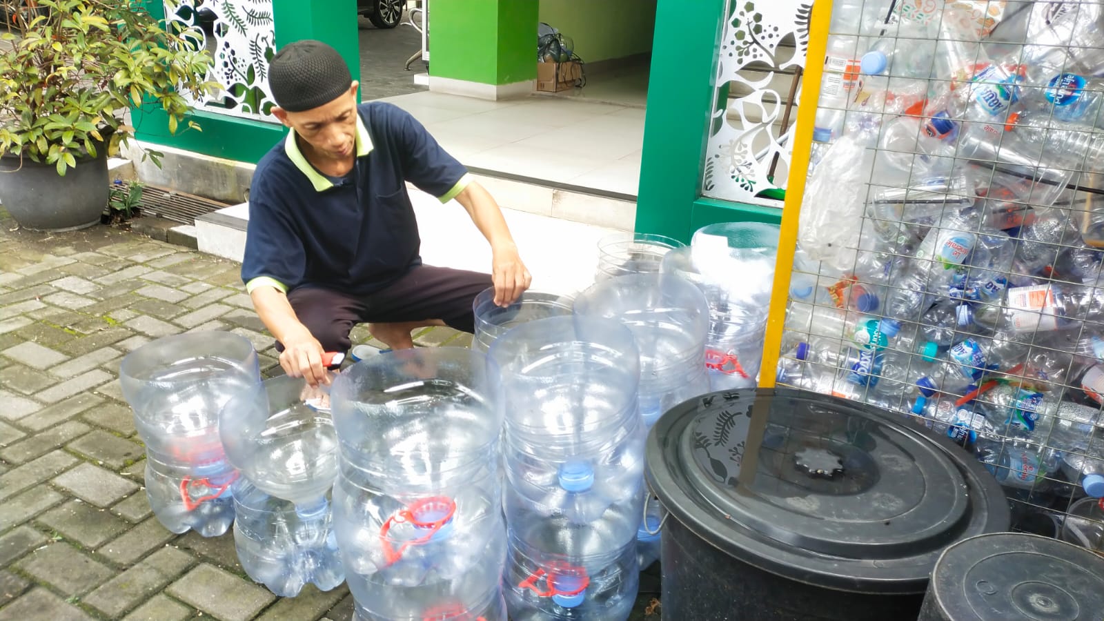 Pegawai MTsN 9 Sleman, Tohari, menjadi pelopor dalam inovasi pengolahan limbah plastik, khususnya galon air mineral bekas. Galon-galon yang sudah tidak terpakai dikumpulkan untuk dimanfaatkan kembali menjadi media tanam. Upaya ini tidak hanya mengurangi limbah plastik, tetapi juga memperindah lingkungan madrasah dengan tanaman hijau yang tertata rapi.