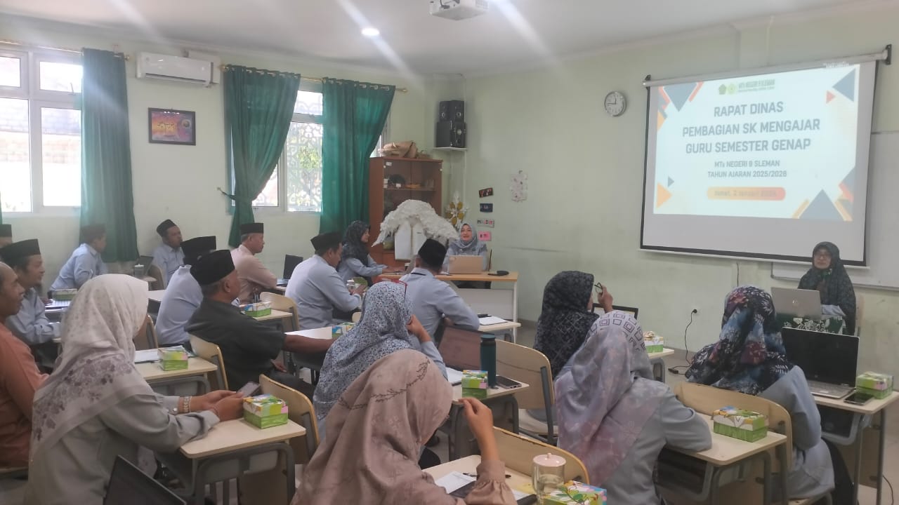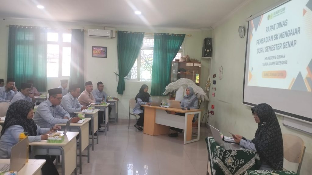 Update Matsama (MTsN 9 Sleman) – MTsN 9 Sleman mengadakan rapat dinas pembagian Surat Keputusan (SK) Mengajar Guru Semester Genap Tahun Ajaran 2025/2026 pada Jumat pagi (02/01/2026). Kegiatan ini dilaksanakan di ruang kelas VIIIB dan dihadiri oleh seluruh Bapak dan Ibu guru MTsN 9 Sleman.
