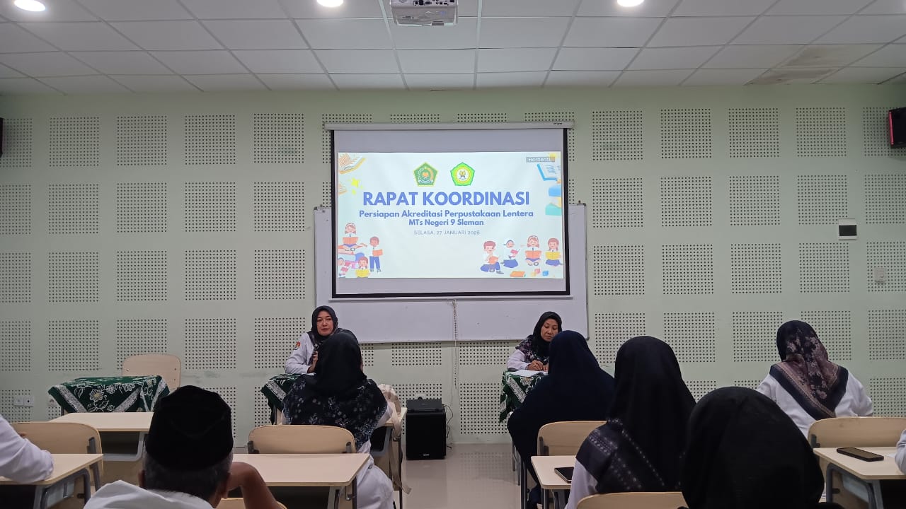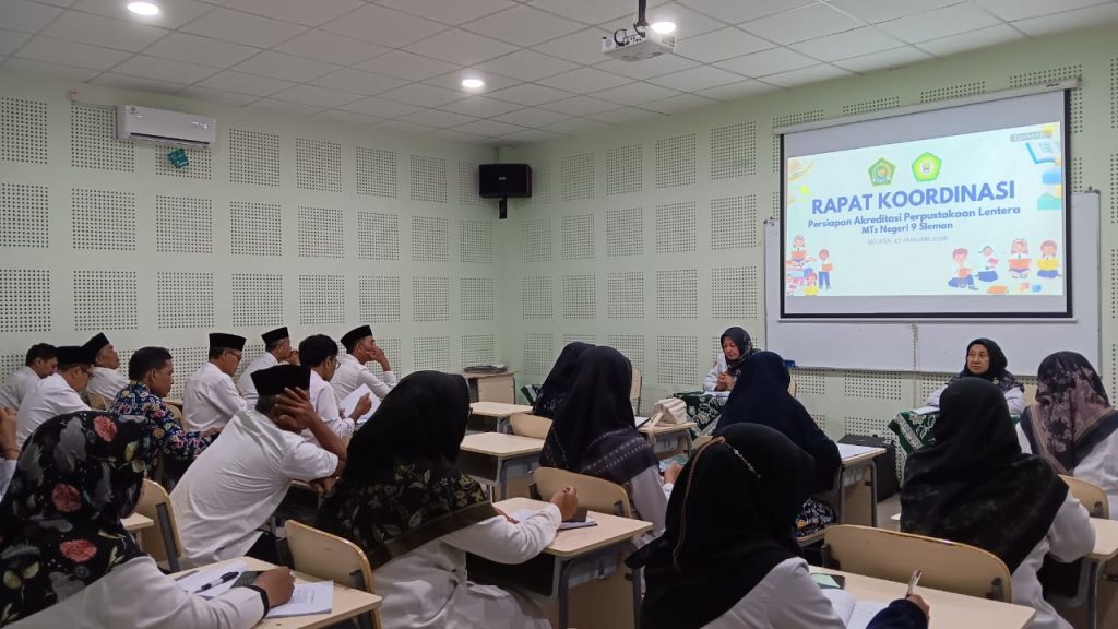 Update Matsama (MTsN 9 Sleman) – MTsN 9 Sleman mengadakan rapat koordinasi persiapan akreditasi Perpustakaan Lentera pada Selasa sore (27/01/2026). Rapat ini bertujuan untuk mempersiapkan Perpustakaan Lentera MTsN 9 Sleman dalam menghadapi akreditasi yang akan dilaksanakan pada bulan Juni mendatang. Seluruh guru dan pegawai MTsN 9 Sleman hadir dalam kegiatan rapat ini.
