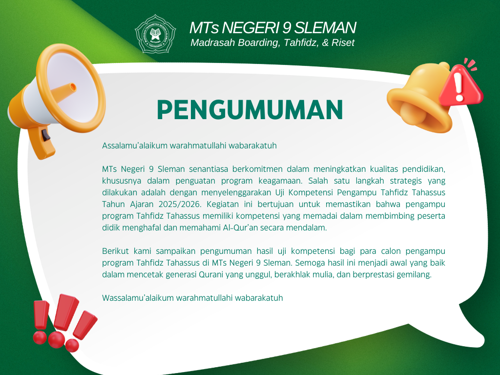 Berikut kami sampaikan pengumuman hasil uji kompetensi bagi para calon pengampu program Tahfidz Tahassus di MTs Negeri 9 Sleman. Semoga hasil ini menjadi awal yang baik dalam mencetak generasi Qurani yang unggul, berakhlak mulia, dan berprestasi gemilang.