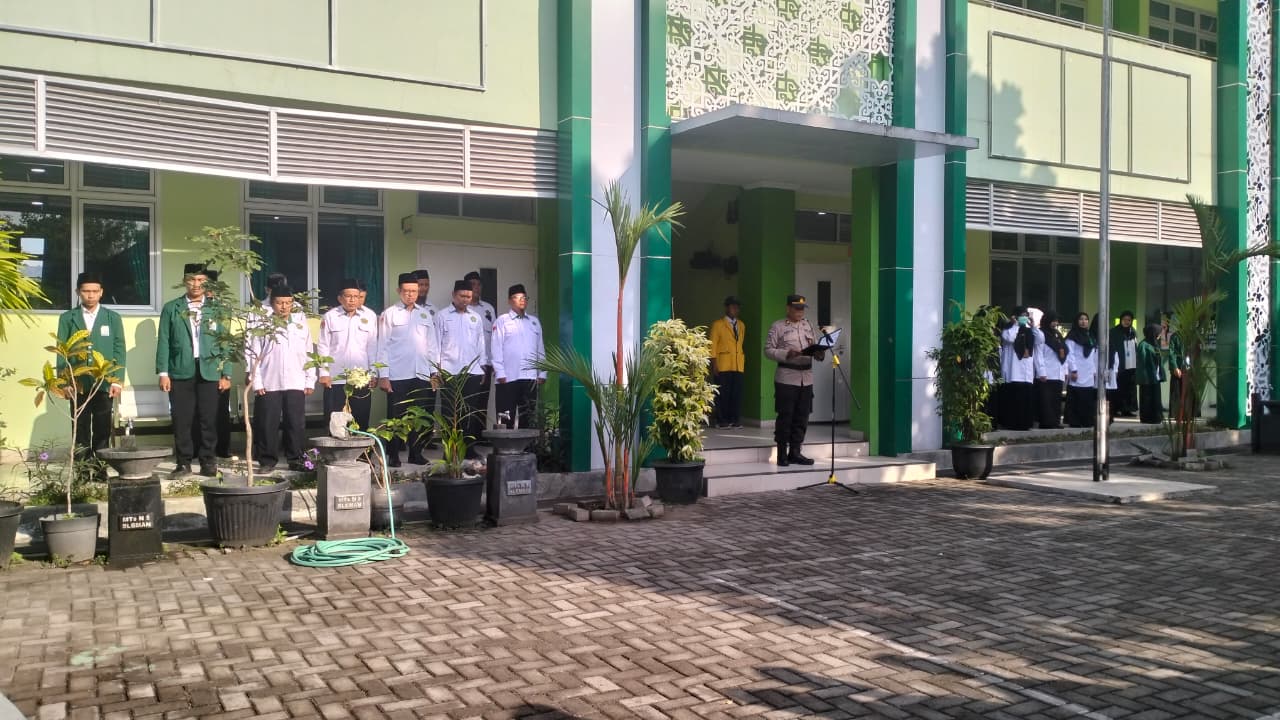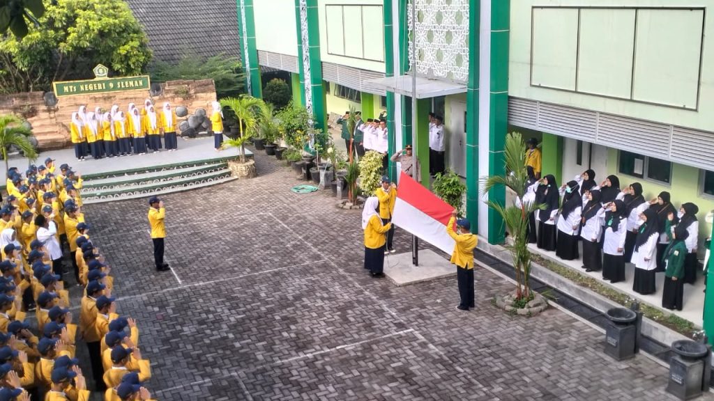 (MTsN 9 Sleman) – Sebelum pelaksanaan kegiatan belajar mengajar (KBM) pada hari Senin (22/9/2025) dimulai, MTsN 9 Sleman menggelar upacara bendera yang dilaksanakan di halaman MTsN 9 Sleman. Upacara dimulai pukul 07.00 dan selesai pukul 07.45 WIB. Upacara diikuti oleh seluruh guru, pegawai, mahasiswa PLP UIN Sunan Kalijaga, dan siswa-siswi MTsN 9 Sleman. Namun, upacara bendera kali ini berbeda dari biasanya karena yang bertindak sebagai Pembina Upacara berasal dari Polisi Bhayangkara Pembina Keamanan dan Ketertiban Masyarakat (Bhabinkamtibmas) dari Sektor Depok Timur yakni Iptu Edy Prayitno.